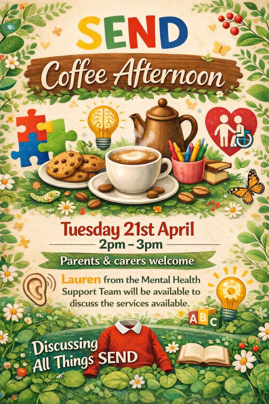 Please see details of the next SEND coffee afternoon on 21/04/26. Lauren from the Mental Health Support ...